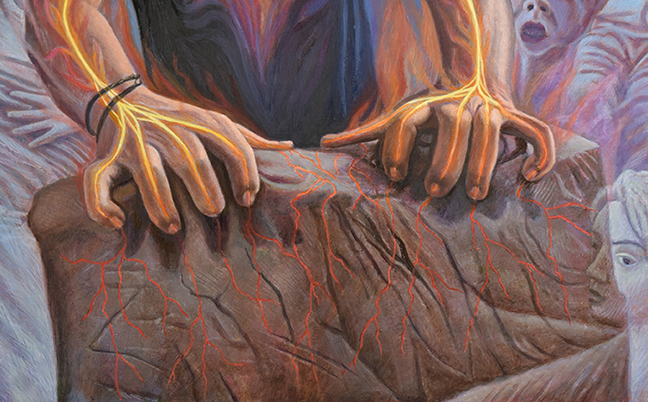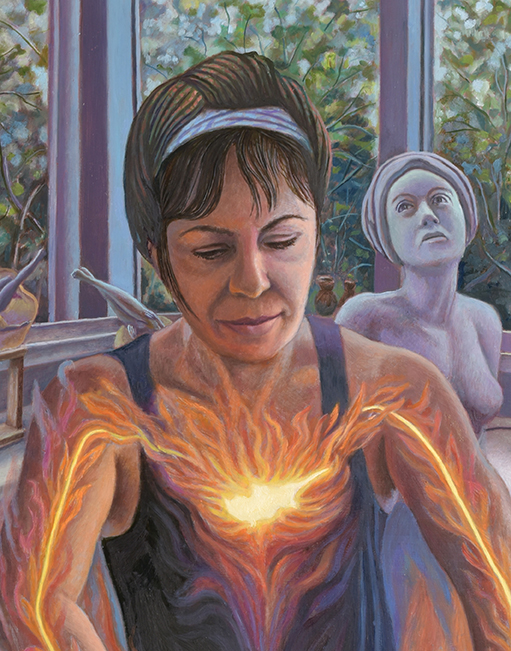In 2008 I visited North Cyprus for a workshop and an exhibition and I met Sevcan Cerkez, an amazing and very well-known sculptor in Cyprus, who was our host; I immediately I felt a strong vibrational connection with Sevcan and she became a very dear friend to me through all these years. Cyprus also made an impact on me, except for the language everything felt so familiar. Back in New York I made a couple of paintings inspired in Cyprus. I was thrilled to go back there after 15 years when I was invited to participate in another workshop and exhibition. This time I stayed at Sevcan`s house after the exhibit which was a wonderful experience. The life size sculptures around the house tricked my senses for moments made me think I saw real people instead of sculptures. Sevcan, Semra, (her twin sister who by the way is a great painter) and their family and friends made me feel so welcome, I felt so connected like half of me was Cypriot. The idea for this portrait started when Sevcan brought clay, and we started to make coffee cups with members of her family and a friend. When she opened the big plastic bag of clay and placed her hands on it, I could imagine the vibration going into the clay and giving life to it, through her hands. In my mind a painting was taking form. Sevcan`s sculptures are in many public places in Cyprus, her work is about Cyprus and its people. I wanted to represent this as a fire in the shape of the island coming from her heart, through her arms and hands, and once into the clay as red veins. Often when Sevcan is making the Turkish coffee, the coffee spills out of the pot, I was told this and it was funny to witness it myself. And to me it was a detail that it needed be included in the painting.